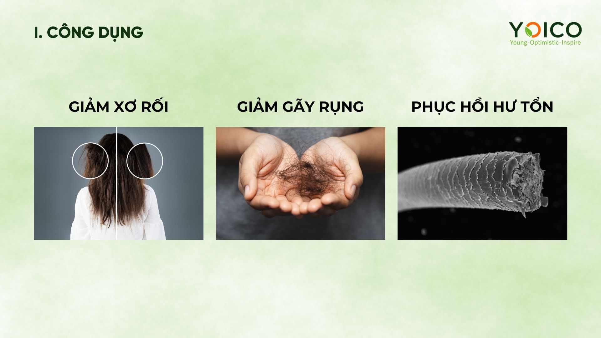 Hỗ trợ phục hồi tóc khô, xơ rối sau khi đã sử dụng hóa chất, tác động nhiệt, cải thiện tình trạng tóc gãy rụng, giúp tóc mọc nhanh hơn, giúp chăm sóc và nuôi dưỡng tóc từ gốc đến ngọn, bảo vệ tóc khỏi các tác nhân có hại, khói bụi ô nhiễm từ bên ngoài, giúp tóc sạch gàu, suôn mềm, thoáng mát da đầu.