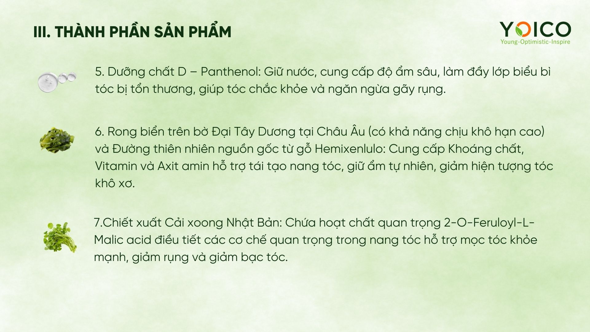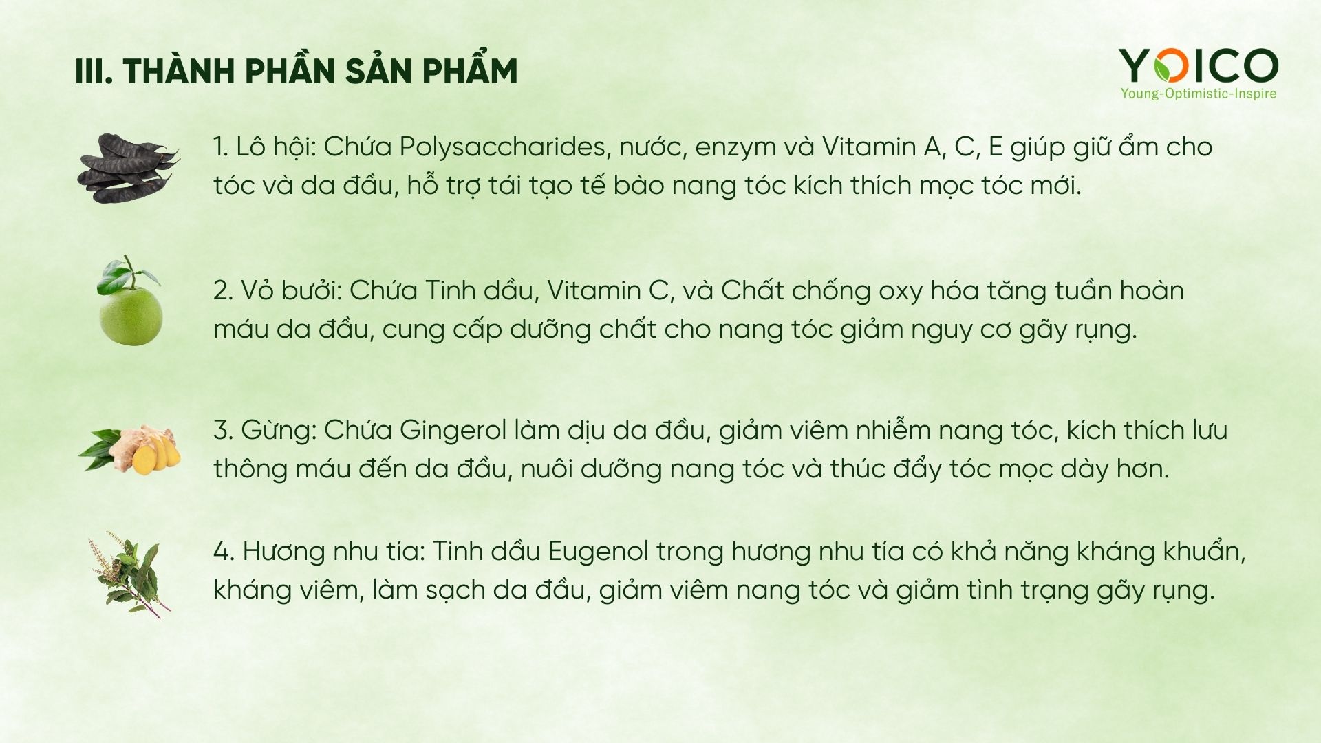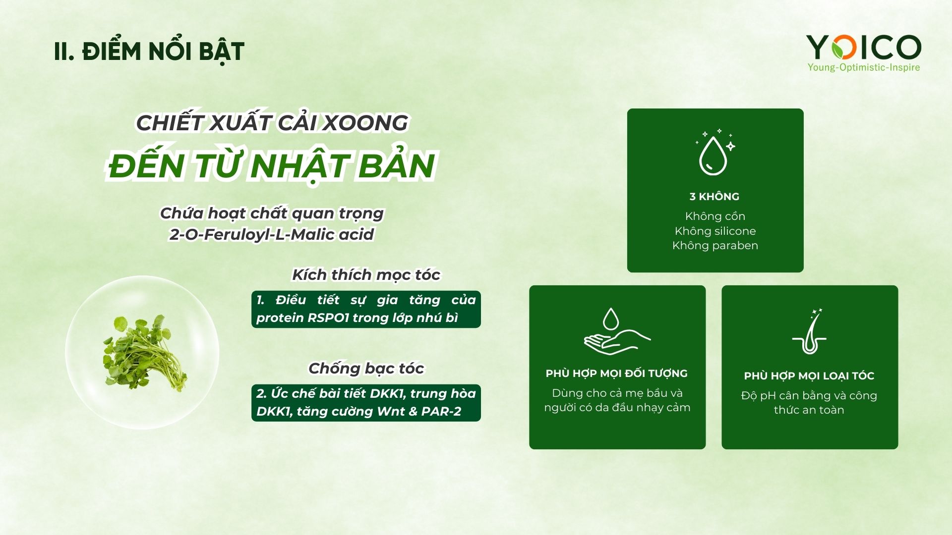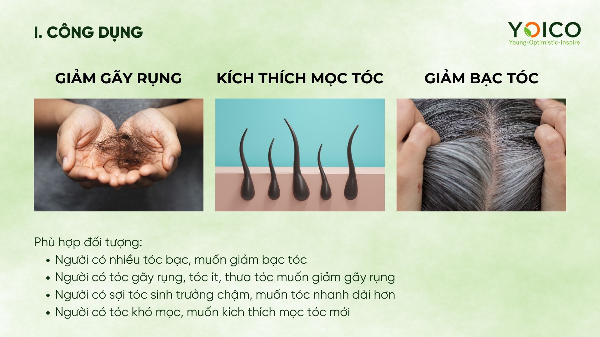 Giảm bạc tóc, kích thích mọc tóc nhanh, hỗ trợ sinh trưởng, giảm gãy rụng, cung cấp dưỡng chất và độ ẩm cho tóc, tăng cường độ chắc, bền, làm mịn, bóng tóc.
