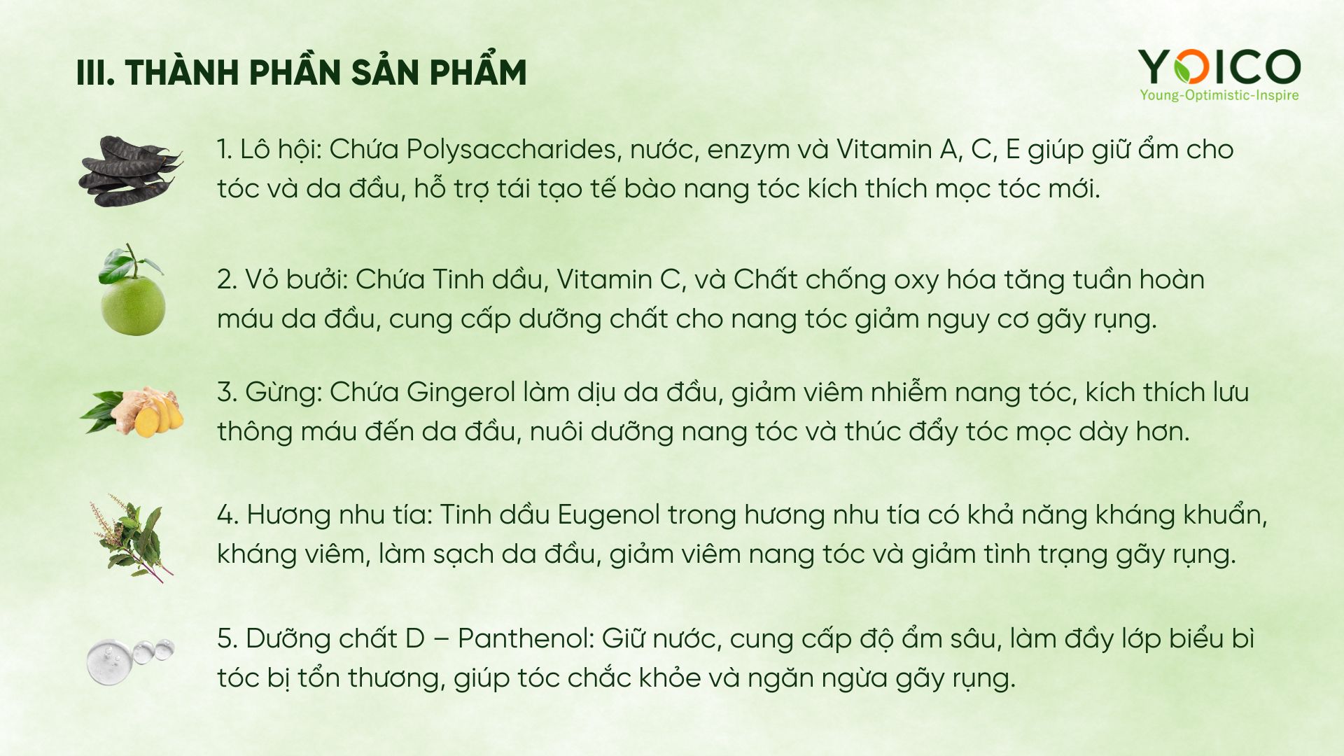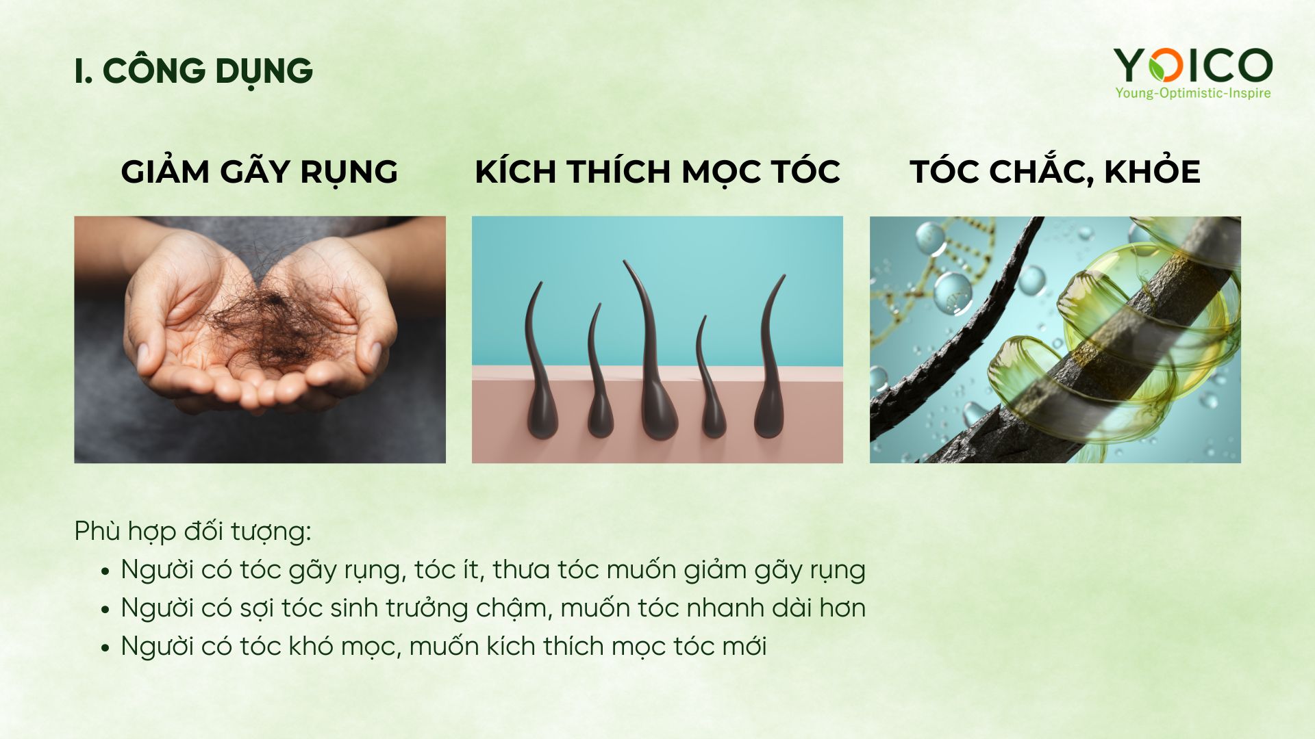 Hỗ trợ sinh trưởng, giảm gãy rụng, cung cấp dưỡng chất và độ ẩm cho tóc, tăng cường độ chắc, bền, làm mịn, bóng tóc